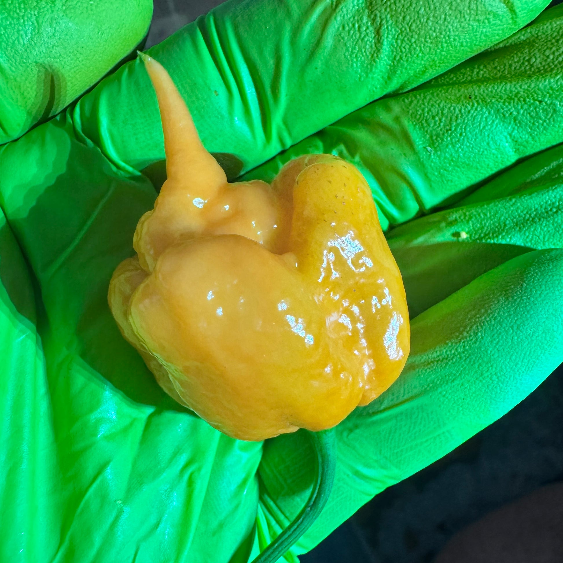 A beautifully deceptive superhot that blends stunning pastel looks with brutal, blazing heat. This rare peach-colored variant of the world-famous Carolina Reaper boasts a searing 1,500,000 to 2,200,000 Scoville Heat Units (SHU), delivering a crisp fruity flavor up front followed by an intense, slow-building fire that lingers. Its wrinkled skin, pointed tail, and soft orange-peach hue make it a showstopper in the garden, while its heat makes it a powerhouse in hot sauces, salsas, powders, and spicy oils.