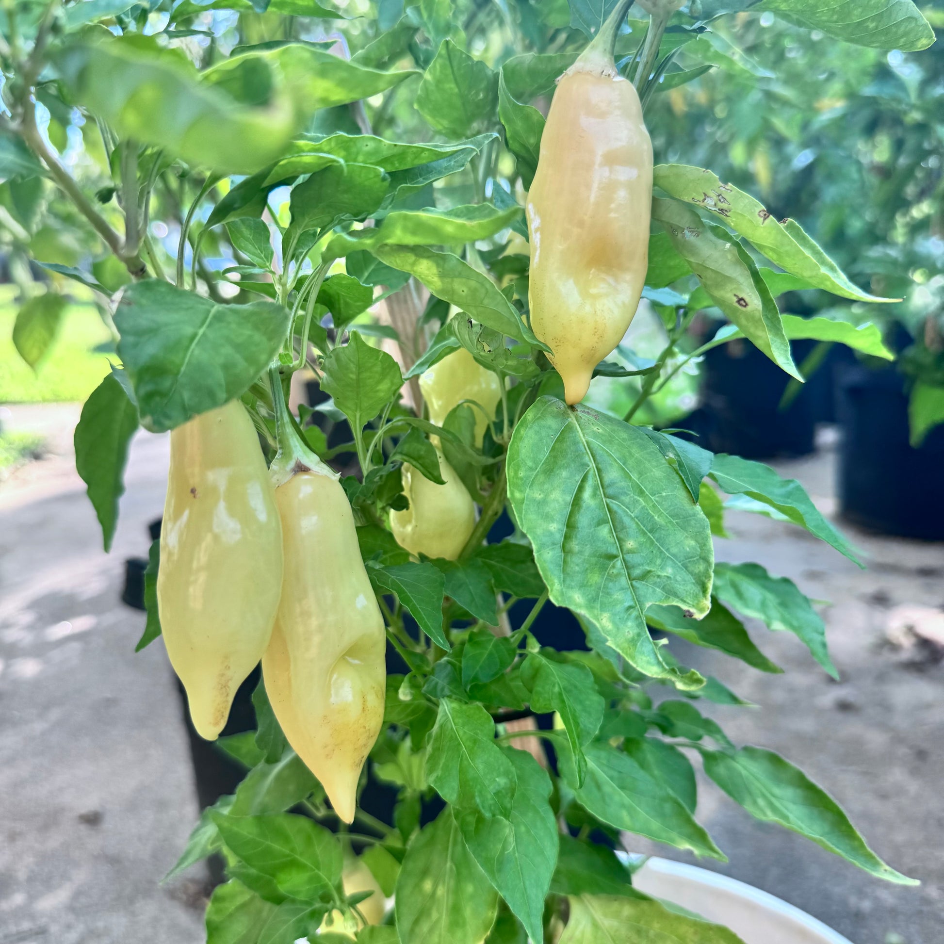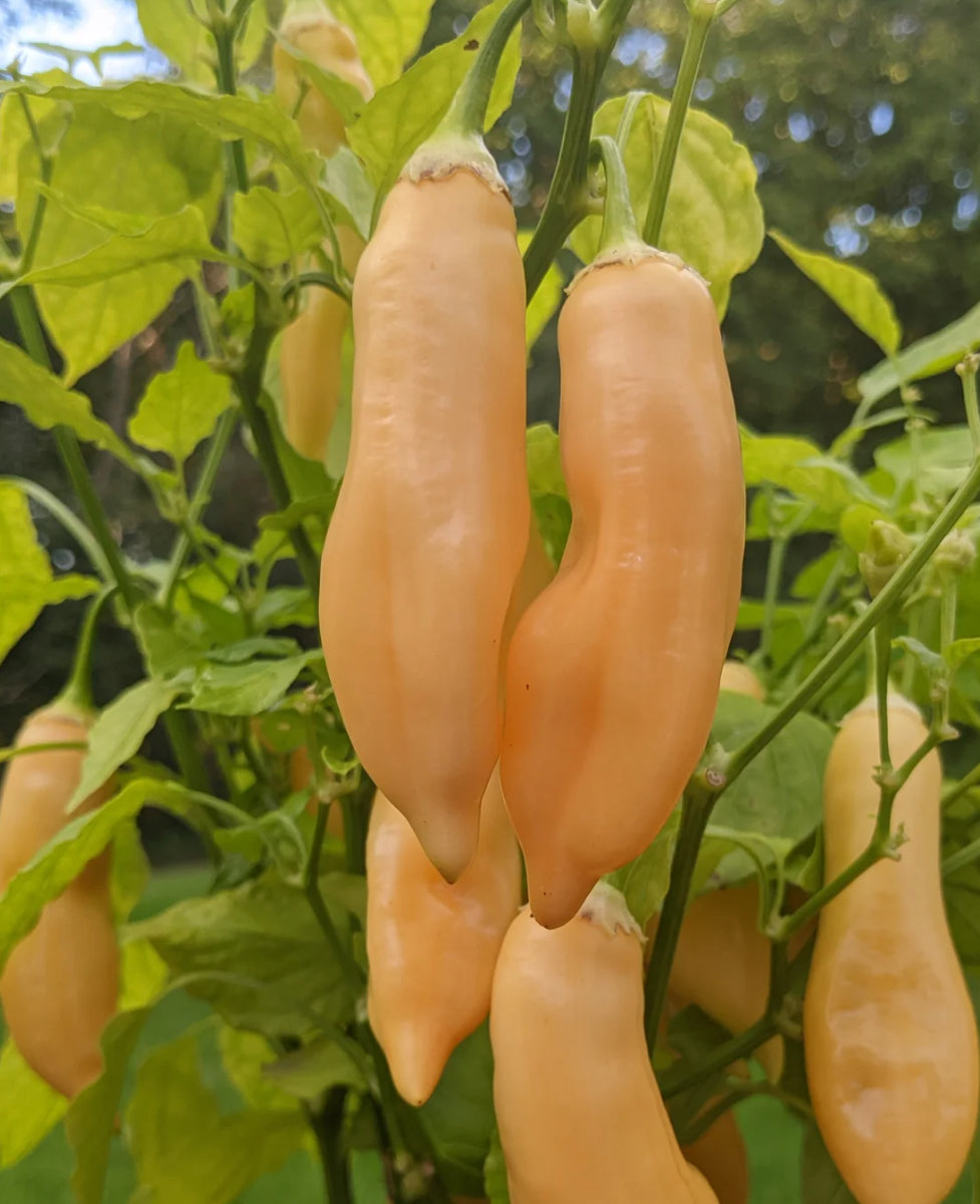 Peach Sugar Rush Suave – a smooth and flavorful twist on the original Sugar Rush line, the Peach Sugar Rush Suave offers all the fruity sweetness with a gentler heat that’s perfect for everyday use. These elongated, peach-colored pods ripen to a soft orange-pink hue and burst with tropical flavor—think apricot, melon, and citrus—with just enough warmth to light up your palate. With a mellow burn of around 5,000 to 10,000 Scoville Heat Units (SHU), this variety delivers sweet heat ideal for hot sauces, fruit-forward salsas, grilling, and snacking straight from the garden. Plants are tall, vigorous, and extremely productive, often producing dozens of beautifully colored pods throughout the season.