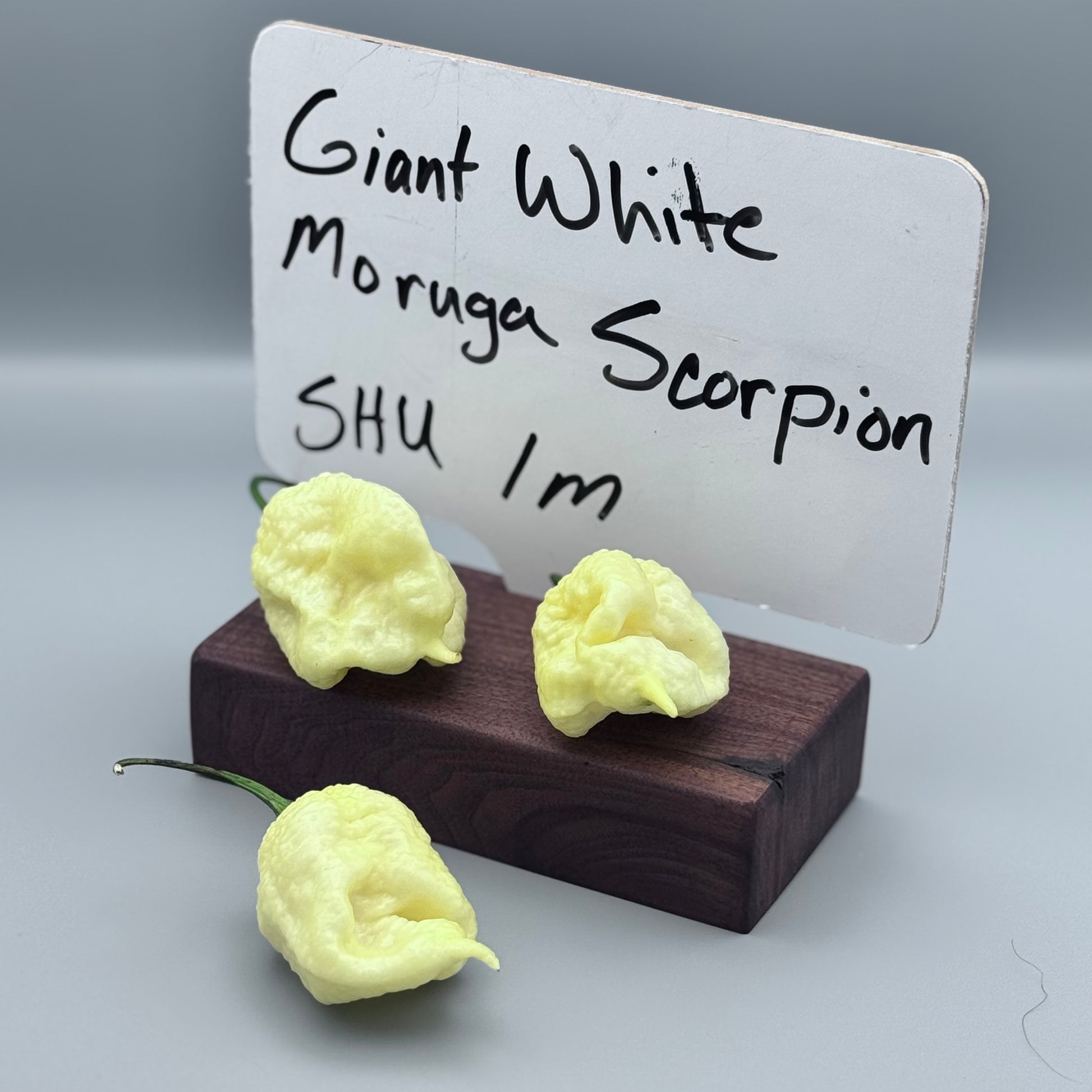 The Giant White Moruga Scorpion is a rare and eye-catching variant of the infamous Moruga Scorpion pepper, believed to be selectively bred from lighter phenotypes within the Capsicum chinense species. Its pale, creamy-white pods may look deceiving, but don’t be fooled—this pepper packs a vicious punch, averaging between 800,000 to 1,200,000 Scoville Heat Units (SHU). Known for its sharp, immediate heat and slightly tangy, floral flavor, it’s a favorite for making uniquely colored hot sauces, chili powders, and fermented blends. While exotic in appearance, it can be moderately challenging to grow, requiring consistent warmth, strong light, and care during fruiting.